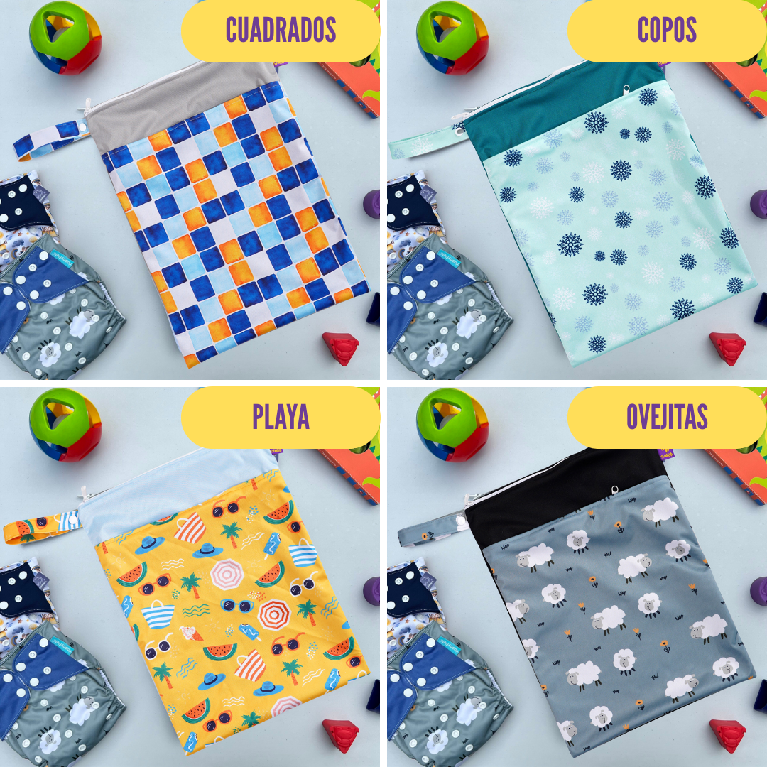 Tamaño ideal hasta 7 u 8 pañales reutilizables de uso diario o artículos similares. Esta bolsa es impermeable, permite guardar los pañales sucios y acumularlos hasta el momento del lavado, sin olores ni humedad.
